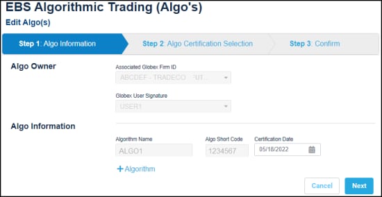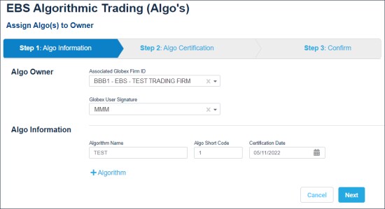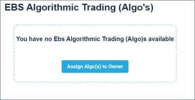 - From the EBS Algorithmic Trading page, select Assign Algo(s) to Owner, then specify Step 1 AlgoInformation.