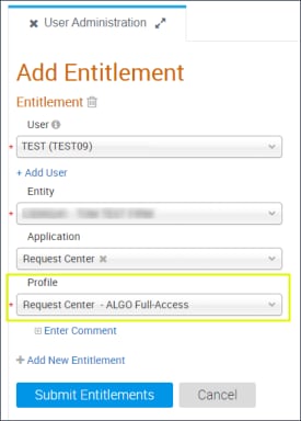 To enable access to Algorithmic Trading functions, authorized Front Office Admin Managers must use the User Administration function to authorize users to view and/or manage this function via the user role: Request Center - ALGO Read-Only / Full.