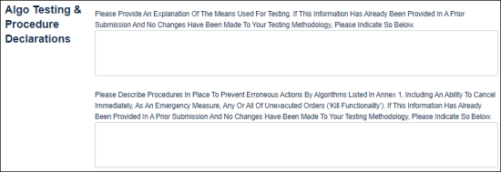 - Add Algorithm: Enter information for additional Algorithmic trading systems registered to the owner (GFID / GUS).
