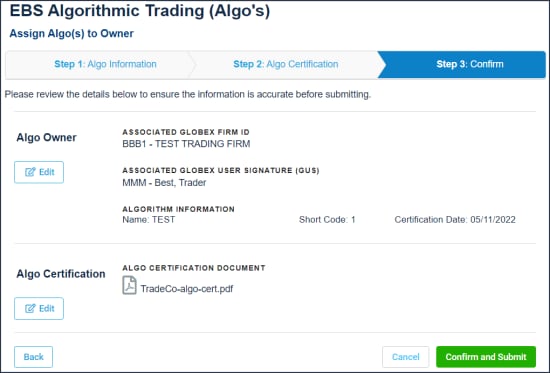 Use the Assign Algo to Owner function to associate algorithmic trading systems with a GFID (Firm) / GUS (Owner) and submit an Algorithmic Trading Annual Certification Form, which certifies conformance to CME Group requirements.
