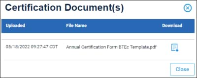 ): Opens a screen to download and view previously submitted certification documents.