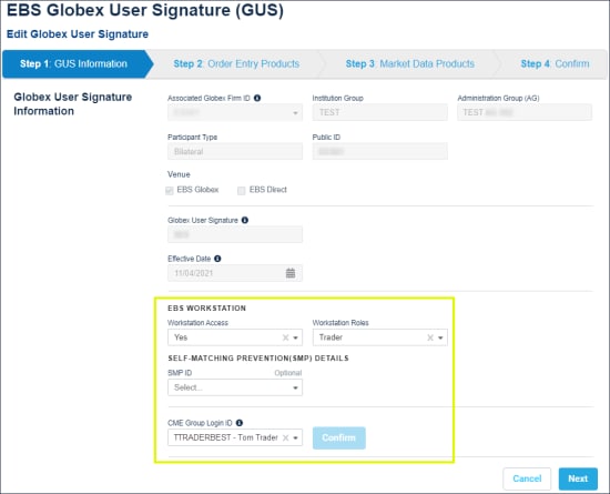 - Globex User Signature: Available selections are based on user entitlements and the associated GFID.