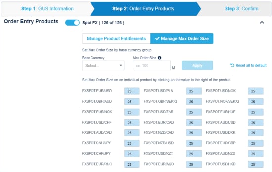 - Currency: In millions of the selected currency (Example: Currency 25 = maximum order size of 25 million GBP).