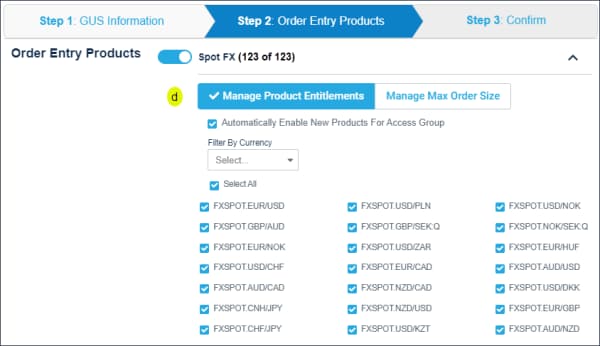 - Product Entitlements: Select / deselect products or use the filter to view products for a particular currency/ metal.