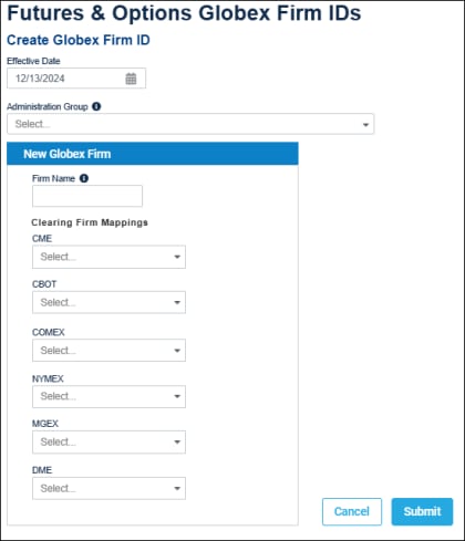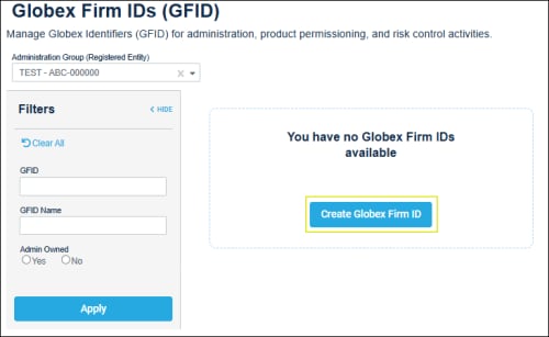 - From the Futures & Options Requests - Globex Firm ID page, select Create Globex Firm ID.