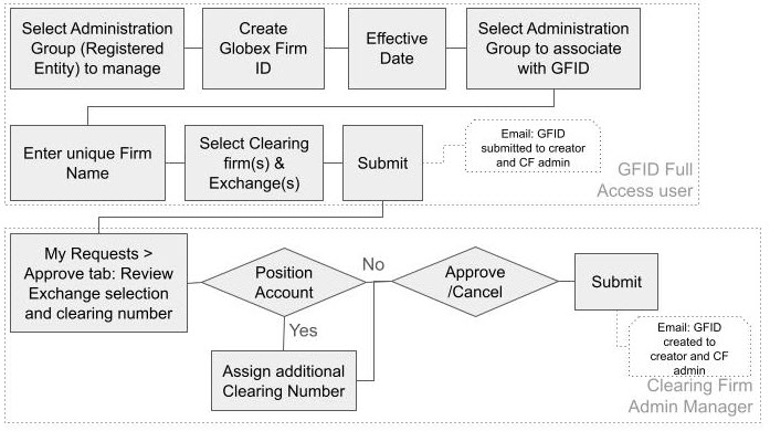 The following instructions illustrate the process for authorized users to create a Globex futures and options GFID trading entity identifier and associate with a clearing firm at an exchange.