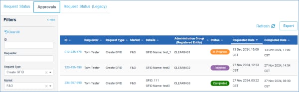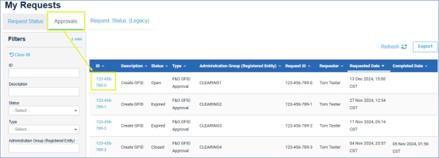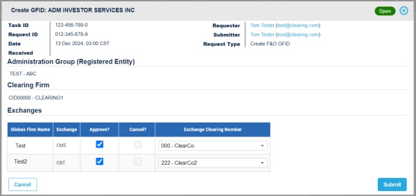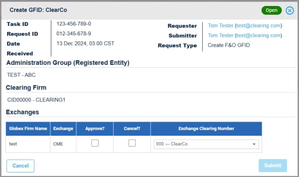 - On the request details screen review GFID details, related details (e.g. confirm / update Exchange Clearing Number) then select a decision (Approve/Cancel).