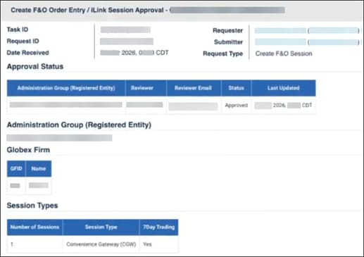 After clearing firm administrator review (if iLink Order Entry session approval is required), session details will be available on the Order Entry / iLink sessions page.