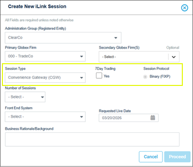 - 7Day Trading: Applicable for CGW type only - Select if the iLink session will be used for 7 day trading.
