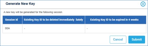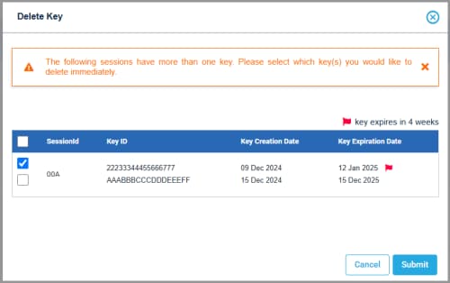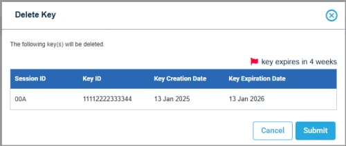- On the Delete Key dialog, select Submit, then verify the code sent to the mobile device.