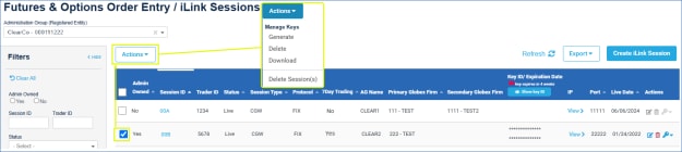 - From the Futures & Options Order Entry / iLink Sessions page,select the checkbox for the session to manage, then select Actions > Generate.