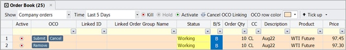 Use the OCO button to begin the process of linking orders. Unlinkable orders include: Synthetic Icebergs orders, Auto hedge orders, Canceled orders, and Fully Filled orders.