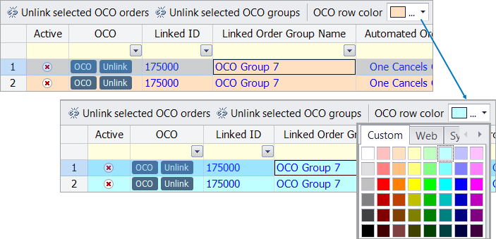 Note: Changing the color of one OCO group row, changes the color of all rows in that group.