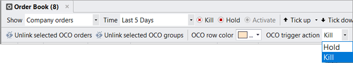 The OCO Trigger Action field allows users to define how OCO orders are treated when an order in a group is fully filled. From the OCO Trigger Action field on the Order Book Toolbar, select either Hold or Kill to define a trigger action.