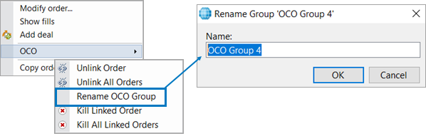 Right-click on any row within an OCO group, and from the context menu, select Rename OCO Group. A Rename Group dialog box displays. Enter a new group Name and click OK.