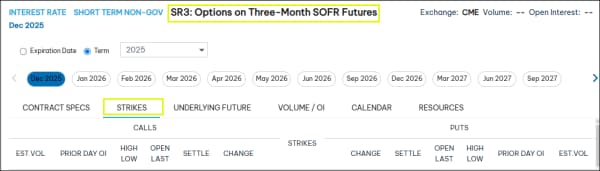 Strikes: Shows strike prices and premium prices for calls and puts when an options product and term are selected in the Product Finder.