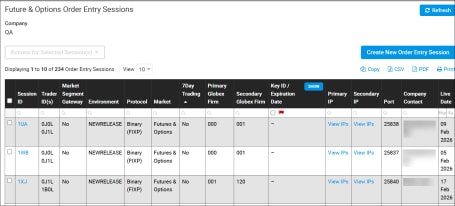 Using the Futures & Options - Order Entry Sessions page, authorized users can create and manage order entry sessions which are used to: