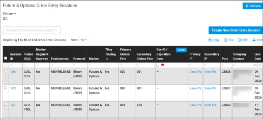 Within a single Company (Primary / Secondary Globex firm), multiple order entry sessions can be created. Users can also generate and manage the secure key pairs that must be used for authentication during the secure logon process for order entry sessions.