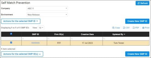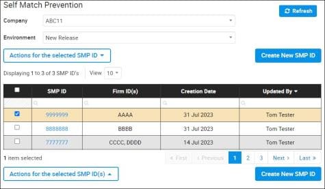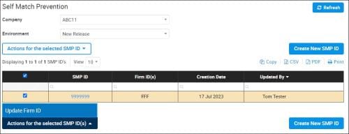 - From the Self Match Prevention page, select the checkbox for a SMP ID to update.
