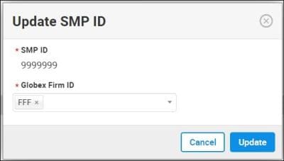 - Select a SMP ID (checkbox) from the list, then select Actions for the selected SMP ID > Update Firm ID.