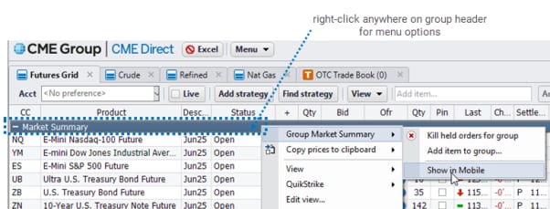 - In the CME Direct client, on either the Futures Grid or Strategies Grid right-click a group (e.g. Group WTI Future), and select Show in Mobile