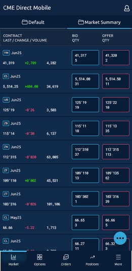 The Market view for the product group appears in CME Direct app: