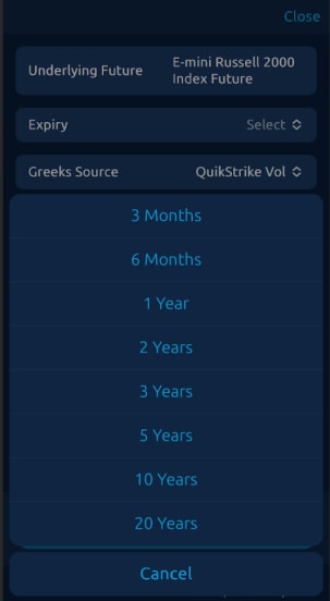 The initial filters window that appears when adding an Options Grid allows users to select an underlying future, expiration date range, and Greeks display.