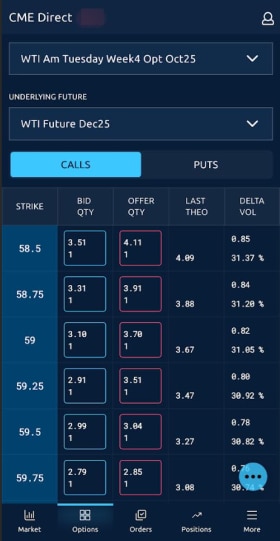 The Options grid displays options market data based on the ATM (or Mid Strike price) for the underlying future and expiration you select. Once populated, the grid allows users to view market activity and summary market data, as well as aggress and submit orders displayed in the grid.