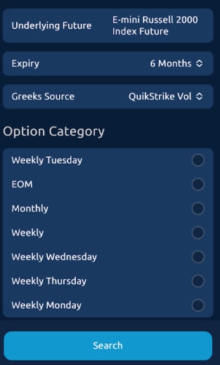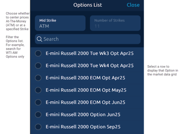 Select Search to open the Options List. Select an option from the list and define the Mid Strike that will populate the Option Grid's market data display.