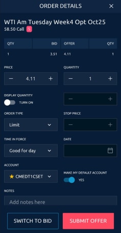 On the order entry window, select an account and submit the Bid/Offer. You may edit the Price, Quantity, and other fields prior to submitting the Bid/Offer.