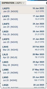 Use the Expiration selector to choose the expected need date for a contract. Default is the front month (nearest expiration).