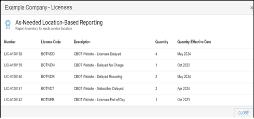- View Licenses - displays the License Number, License Code, Description, Quantity, and Quantity Effective Date per location or service for as-needed inventory reporting.