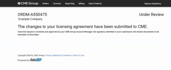 Customers may receive an invitation from their Global Account Manager to update their license agreements. Updates are done via a maintenance order, which are created by the CME Account Manager and an invitation is provided to Customers via an email, which contains a link to the order in the Data Services portal. You may also access your orders from the portal by selecting Orders in the Menu Bar. From the Your Orders list, select >>View for the order.