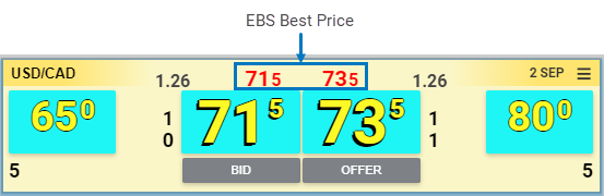 The EBS Best Price, shown in red on the Price Card header represents the single best price in the EBS Market for a given instrument pair, regardless of credit. The EBS Best Price is for display purposes only.