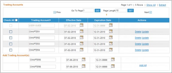 NOTE: If the number of Trading Accounts registered exceeds 10, the system will automatically paginate the list at this time. To display all Trading Accounts, select the Show All hyperlink to remove the pagination.