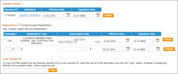 - To copy all of the details from the selected Operator ID to a new Operator ID (including its associated Exchanges, Registration Types, Effective and Expiration dates) enter the New ID in the Copy Operator ID field and click Copy. All details will be copied exactly the same.