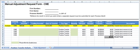 The Manual Fee Adjustment Template for each Exchange is located on the Exchange’s homepage. Click on the hyperlink ‘Adjustment Template’ to download the template. The Fee Adjustment template has two types of worksheets: Position Transfer Rebate and Rate Adjustment.