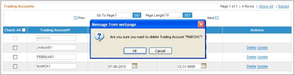 - Identify the appropriate row containing the trading account to be deleted. Select the Delete hyperlink in the Actions column for that row.