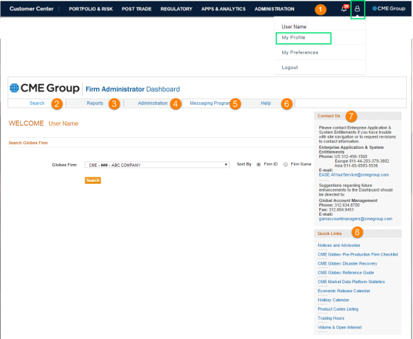 - Navigation Bar - Access CME Group enabled applications from the Portfolio & Risk, Post Trade, Regulatory, Apps & Analytics, and Administration drop-down menus; modify your profile from the Profile icon and select My Profile.