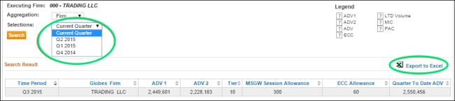- Select the Session Stats tab. This automatically displays the Globex Firm ID’s Average Daily Volume (ADV) for the last 2 quarters, corresponding MSGW iLink Session Allowance and MSGW iLink Session ID Excess Capacity (ECC) Allowance. Please note that as documented in the iLink Session ID Policy and Operational Guidelines documentation, starting September 11, all Globex Firm IDs will default in the FADB to display only 2 MSGW sessions as that is the maximum allocation customers deploying a front end system which has certified to MSGW functionality may request.