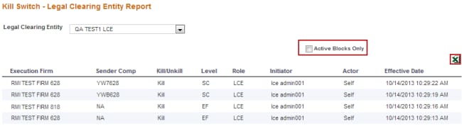 Kill switch reports show all firms killed for a Legal Clearing Entity (LCE).