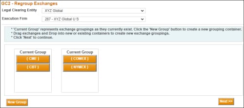 Use the Regroup Exchanges function to create or modify a Legal Clearing Entity & Executing Firm ID association with an exchange / group of exchanges.