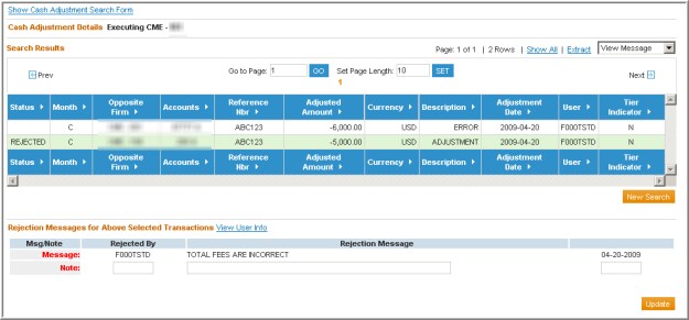 Executing firms can view messages and notes to see why a cash adjustment was rejected by the carrying firm.