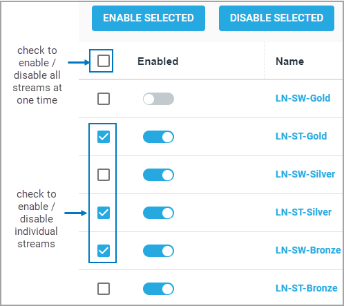- Select the checkbox next to each stream or click the checkbox at the top of the column to enable/disable all the streams.