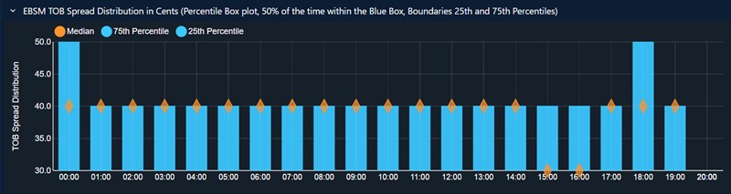 A box-whiskers (percentile) plot that buckets TOB EBS Market spreads into an hourly statistical plot. The median spread is shown in orange. The blue box highlights the range observed 50% of the time between the 25th and 75th percentiles.
