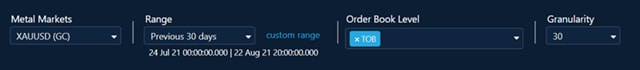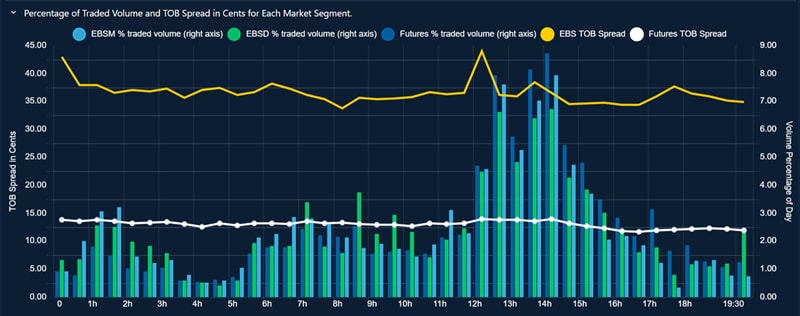 - Overlays the bid-ask spread for the selected order book levels for EBS Market and futures.