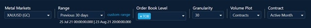 A look at CME Group metals futures order book volume for the selected order book levels.