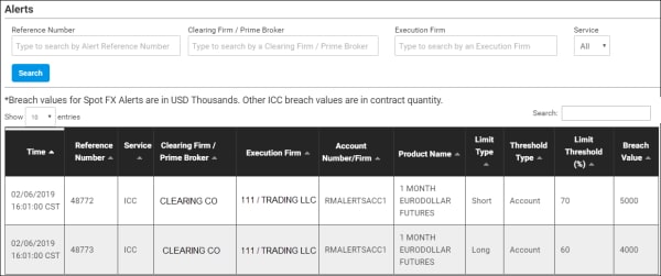 Use the Alerts function to view a list of thresholds that have been breached, for ICC and or FX Spot. Alerts are sent to designated recipients