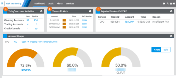 Clearing, Execution and Trading Firm risk administrators can monitor account and firm trading activity, including usage against maximum permissible limits.