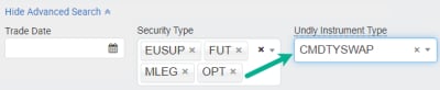 - Select an option from the drop-down menu for Security Type. You may select multiple securities by using the drop-down menu and selecting another security. You may remove a security by selecting its respective x. If you select OPT for Options, the Undly Instrument Type field appears; select the underlying instrument.